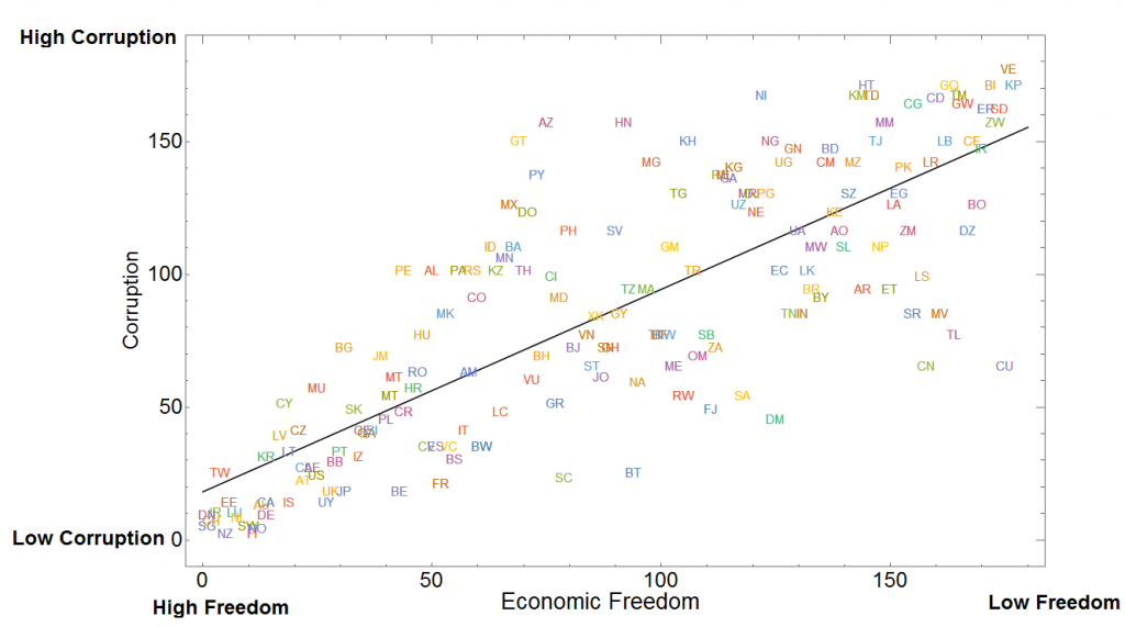 Вот график, координаты которого экономическая свобода (The Heritage Foundation Index of Economic Freedom 2023) и коррупция (Corruption Perceptions Index 2020-2022). Страны на графике обозначены их доменными именами.
