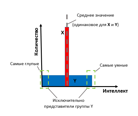Рассмотрим общество, состоящее из равного количества представителей этих групп. Возьмём 10% самых умных (или самых глупых) людей. Внезапно они все поголовно оказываются представителями группы Y. Но ведь средние значения равны? Да, равны. Но в жизни нет никакого резона равняться на средних.